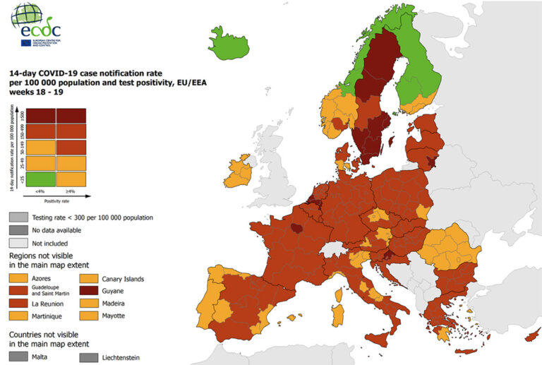Avaldatud: 21 mai, 2021Koroonaga nakatumiste tase püsib Eestis jätkuvalt kõrge, selgub, Euroopa haiguste kontrollikeskuse ECDC värskest ülevaatest.