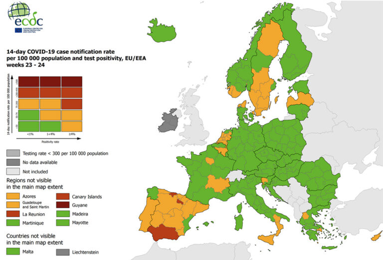 ECDC indikatiivse koroonakaardi järgi on Euroopa valdavas osas roheline, välja arvatud Punased laigud mitmel pool Hispaanias ning kollased laigusd Portugalis, Prantsusmaal, Itaalias, Belgias, Taanis, Rootsis, Norras, Lätis Kreekas ja Küprosel.