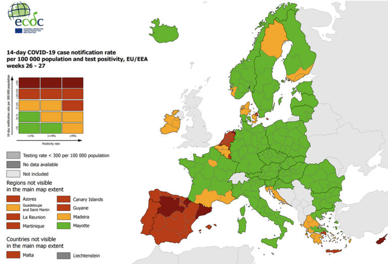 ECDC indikatiivse koroonakaardi järgi on Euroopa tervikuna roheline, aga väga punaseks on tõmbunud Euroopa lõunaosa, see on Hispaania, Portugal ja Küpros. Samuti on punased Belgia, Holland, Luksemburg ja Taani põhjaosa, osaliselt Saksamaa ja Kreeka.