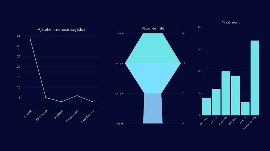 Ilmumissagedus on valdavalt rutiinne. Kõige levinum on 12 numbrit aastas (33 vastajat), seejärel 2 korda kuus (6), 10–11 numbrit aastas (5), 5–8 numbrit aastas (3) ning kord nädalas (3). Ka levik räägib paberlehe kasuks: 60,9% jagab lehe kõikidesse leibkondadesse ning 30,4% kombineerib kojukannet ja avalikke kohti. Leht on valdavalt tasuta (89,8).