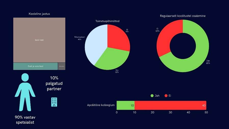 Toimetuspõhimõtted on küsitluse järgi olemas pigem pooleldi: 32% „jah”, 40% „töös/osaliselt” ja 28% „ei”. Apoliitiline kolleegium või nõukoda on olemas vähestel, enamikul puudub. Valimisperioodi kajastuses domineerib praktika, kus järgitakse tava, kuid kirjalikku korda ei ole.