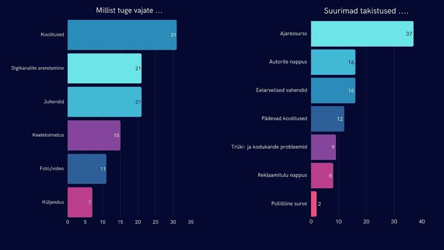 Suurim takistus on ajaressurss (37), seejärel autorite nappus (16) ja eelarvelised vahendid (16); poliitilist survet nimetatakse harva (2). Kvaliteedi tõstmiseks soovitakse enim koolitusi (31) ning digikanalite arendamist ja juhendeid (mõlemad 21).