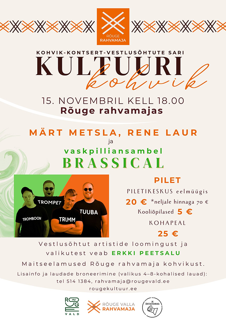 Avaldatud: 13 november, 2025Rõuge rahvamaja käesoleva hooaja esimese poole tippsündmuseks on sel laupäeva, 15. novembri õhtul toimuv Kultuurikohvik, kus astub üles vaskpilliansambel Brassical. Ansambliga on seotud Võrumaalt pärit muusikud Rene Laur ja Märt Metsla.