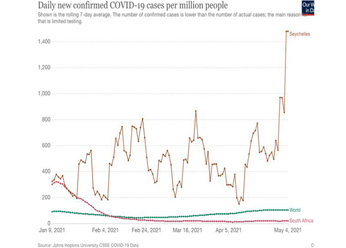 New York Times nakatumiste ülevaate kohaselt on Seychellid praegu maailmas nakatumiste arvult ülekaalukalt number üks. Seal tuvastati viimase 7 päevaga keskmiselt 149 nakatumist päevas 100 000 elaniku kohta. Võrdluseks, Soome vastav tase on 4 ja Eestis 27.