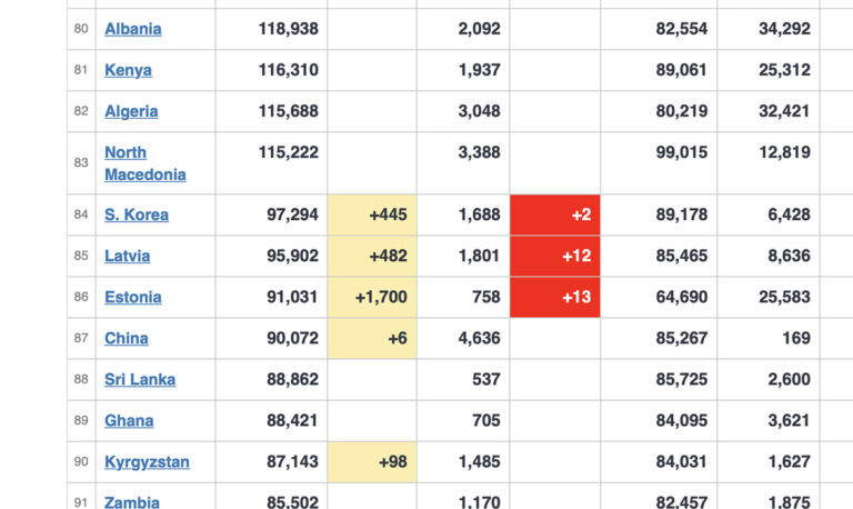 Eesti jõudnud nakatumiste arvu poolest Läti kandedele, Lätis elab samuti rohkem inimesi kui Eestis. Lõuna-Korea on samuti haardeulatuses, seal on tuvastatud 97 294 koroonaga nakatumist. Lõuna-Koreas elab 52 miljonit inimest, 40 korda enam kui Eestis.