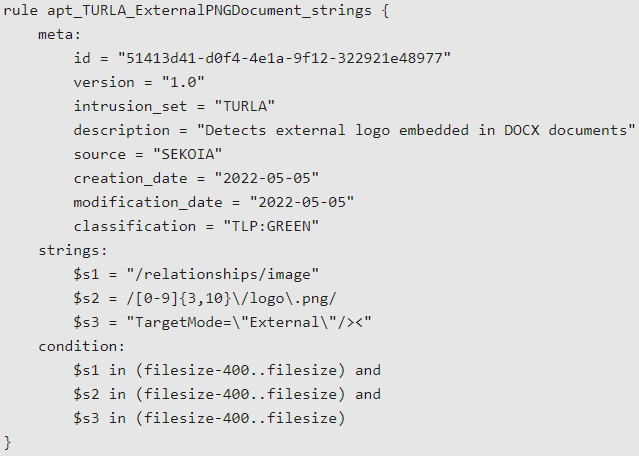 Et võimaldada kaitsjatel seda tegevust tuvastada, on Sekoia esitanud järgmise Yara reegli: