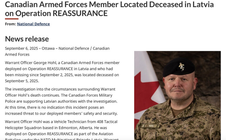 Avaldatud: 7 september, 2025Kanada relvajõudude liige, vanemveebel George Hohl, kes oli lähetatud Lätti operatsioonile REASSURANCE ja kes oli kadunud alates 2. septembrist 2025, leiti surnuna 5. septembril 2025.