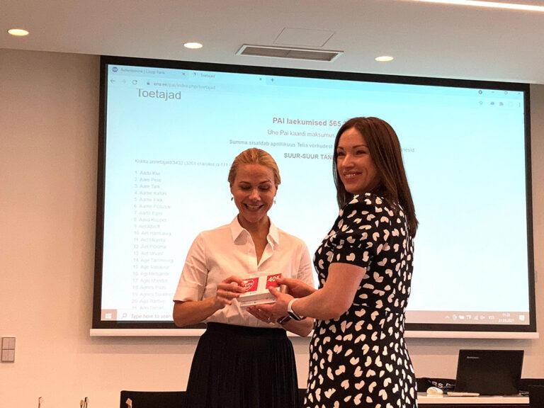 LHV Panga juhatuse esinaine Kadri Kiisel annab PAI kaardid üle haiglaõele Irina Kuznetsovale. Foto: PAI Eesti õdede ja hooldustöötajate tunnustamiseks ja tänamiseks loodud PAI aktsiooni algatajad määrasid PAI kaardi väärtusteks vastavalt 40 ja 10 eurot – kokku 50 eurot igale PAI kaardi saajale, mis jõuavad ligi 12 tuhande inimeseni juba jaanipäevaks. Esimesed 1300 kaarti, koguväärtuses 65 tuhat eurot anti esmaspäeval üle Tallinna Lastehaigla ja Ida-Tallinna Keskhaigla esindajatele.