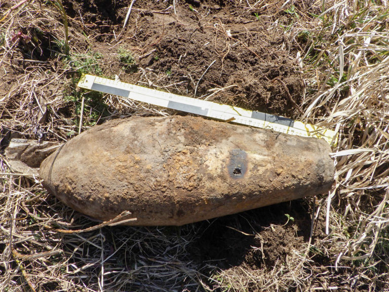 8. aprillil Tartu lähedalt Tila külast kraavi kaldalt leitud 50-kilone lennukipomm. Foto: Lõuna päästekeskus Lõuna-Eesti pommigrupp tegi eelnevatel päevadel kahjutuks terve hulga lõhkekehi, mis olid maa seest välja tulnud.