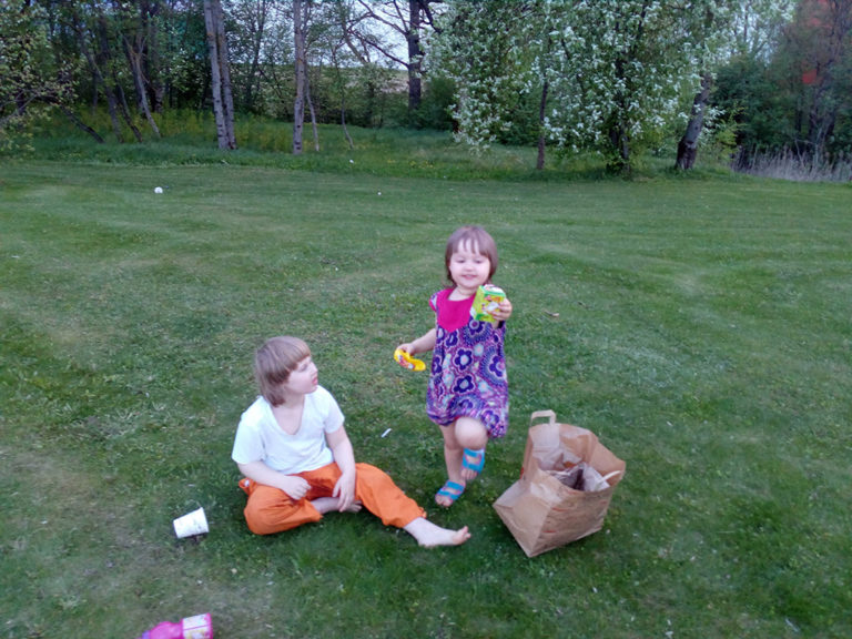 Oli tõesti jumalik ilm ja ma poleks kuidagi tahtnud autos einestada. Siis märkasin, et kaubanduskeskuse juures, otse parkla kõrval õitsevad toomingad. Ja rohi on Leedus juba praktiliselt põlvini. Miks mitte teha sealsamas üks väike mõnus piknik. Roosi meil viimasel ajal muud ei räägigi, kui et teeme pikniku, teeme pikniku. Kui Inno Hesburgerist naases, siis teatasingi talle rõõmsalt, et kolime oma einega sinnasamma õitsva toominga alla. Kõik olid päri ning ma pean ütlema, et see oli meie reisi ja üldse meie reiside üks toredamaid elamusi. Piknik Leedus, kaubanduskeskuse juures murul, õitsva toominga all. Elu nautimiseks ei pea alati palju raha kulutama. Inno ütles, et Hesburgeris kulus tal ainult neli eurot – lasteeine pluss rukkivõileib ning kohv. Jätkus meile kõigile ning jäi ülegi. Enne seda olime söönud autos kodust kaasa võetud toitu ja Katariina kohviku saiakesi, mis polnud samuti veel otsas.