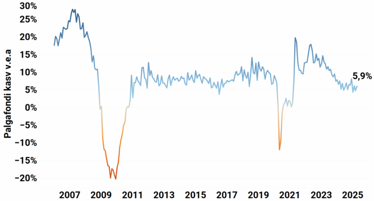 Palgafondi kasv ulatus aprillis kuue protsendi lähedale (vt joonis), töökohtade arv oli väikeses languses. Aprillis vedas palgakasvu muude teenuste sektor, üheks põhjuseks on tegevusalade klassifikaatori muudatus, millega liigitati mootorsõidukite remont antud tegevusala alla. Töökohtade arvu langus oli aprillis võrreldes eelmise aastaga suurim kaubanduses, osaliselt põhjustas seda eelnimetatud klassifikaatori muudatus. Nii sotsiaalmaks kui ka kohalikele omavalitsustele laekuv füüsilise isiku tulumaks kasvasid aprillis sarnases tempos palgafondiga.