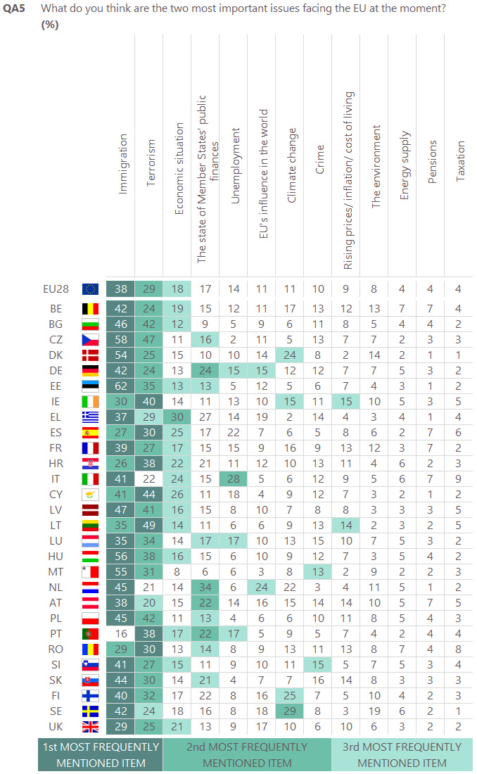 Kõigi Euroopa Liidu riikide arvestuses ongi immigratsioon kõige olulisem ELi probleem (seda peab kõige suuremaks probleemiks keskmiselt 38 protsenti vastanutest). Järgnevad terrorism (29 protsenti) ja majanduslik olukord (18 protsenti).