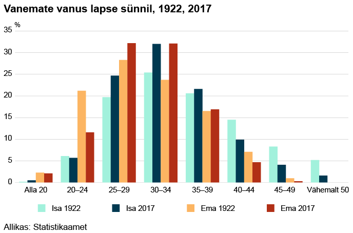 Mis ei ole saja aastaga muutunud – endiselt sünnib lapsi, kelle isa on alla 25-aastane, väga vähe, vaid igal 17. lapsel on nii noor isa. Iga viienda lapse isa oli lapse sünnil nii praegu kui ka saja aasta eest 35–39-aastane. Levinuim isaks saamise iga oli mõlemal perioodil 30–34. Samas on saja aasta taguse ajaga võrreldes rohkem mehi, kes on lapse sündimise ajal 25–34-aastased — 1922. aastal sündis 45 protsenti lastest selles vanuses isadele, praegu 57 protsenti. Vastupidine oli olukord 40-aastaste ja vanemate meeste puhul: sada aastat tagasi oli isasid, kes olid oma lapse sünnil vähemalt 40-aastased 28 protsenti, tänapäeval 16 protsenti.