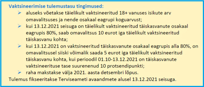 Avaldatud: 11 november, 2021Riik kutsub jätkuva koroonakriisi olukorras kohalikke omavalitsusi üles vaktsineerimist igati soodustama ja korraldama. Selleks on välja töötatud rahalised motivatsioonimeetmeid, mida omavalitsused aasta lõpuni vaktsineerimise organiseerimisel saavad silmas pidada. Näiteks nähakse 80 protsendi täisealiste elanike vaktsineerituse taseme saavutamisel omavalitsusele ette 10 eurot iga vaktsineeritud elaniku kohta.