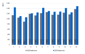 Maksude laekumine 12 kuu lõikes 2024. ja 2025. aastal. Allikas: MTA