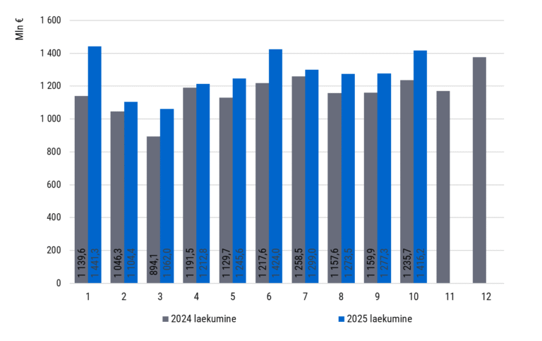 Maksude laekumine 2025. aasta kümnel kuul võrrelduna 2024. aasta üheksa kuuga valitud maksudes. Allikas: MTA