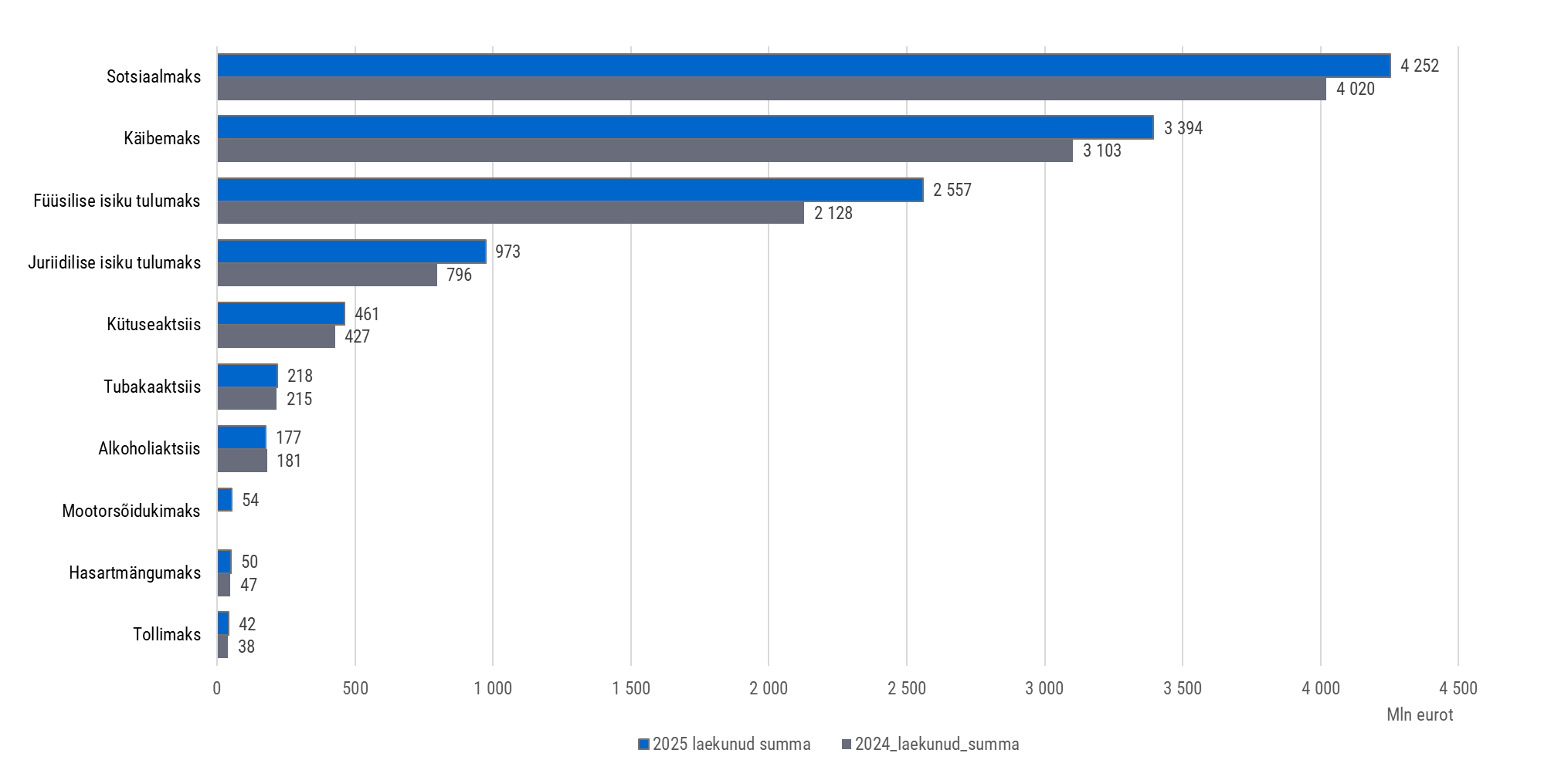 Füüsilise isiku tulumaksu laekumine on kümne kuuga kasvanud kõige enam ehk kokku 429 miljoni euro võrra, sh oktoobris 69 miljonit eurot. Sotsiaalmaksu laekus samal perioodil 232 miljonit eurot rohkem kui mullu, suurenedes oktoobris 26 miljoni euro võrra.