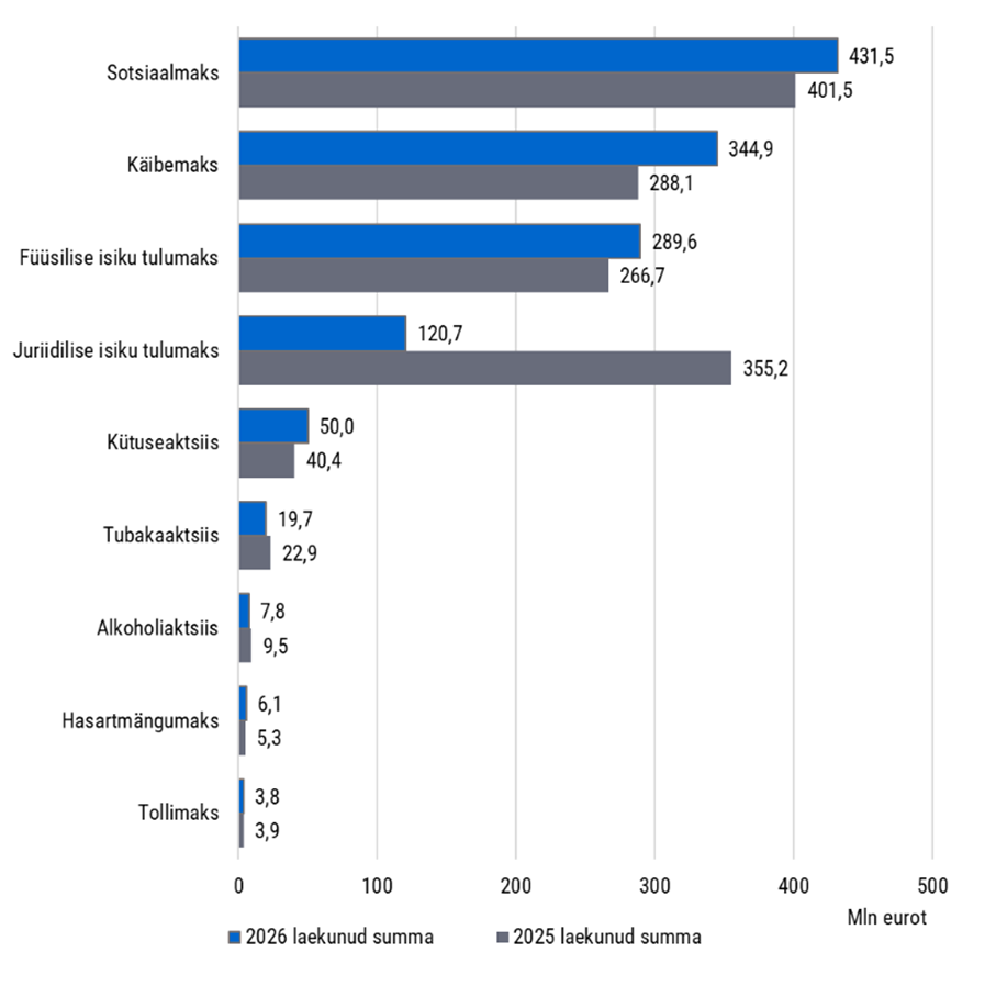 Avaldatud: 16 märts, 2026Võrreldes möödunud aasta jaanuariga laekus tänavu makse mõnevõrra vähem. Peamine põhjus on see, et eelmisel aastal laekus jaanuaris erakordselt palju juriidilise isiku tulumaksu. 2026. a. jaanuaris laekus juriidilise isiku tulumaksu 234 miljonit eurot vähem kui eelmisel aastal samal ajal.