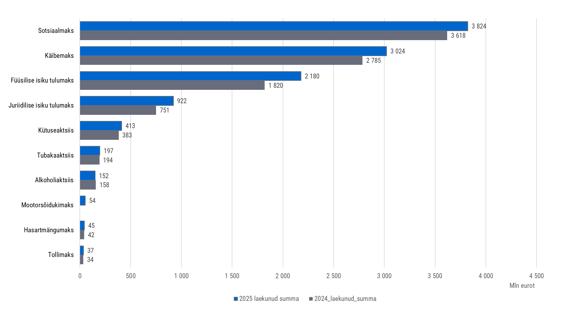 Maksude laekumine 2025. aasta üheksal kuul võrrelduna 2024. aasta üheksa kuuga valitud maksudes. Allikas: MTA