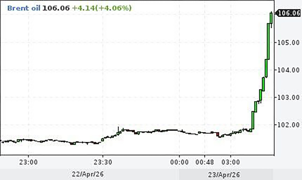 Avaldatud: 23 aprill, 2026Nafta hind hakkas täna neljapäeval, 23. aprillil taas kiiresti tõusma. Enimkaubeldud toornafta Brenti hind kerkis 106 dollari peale barrel.