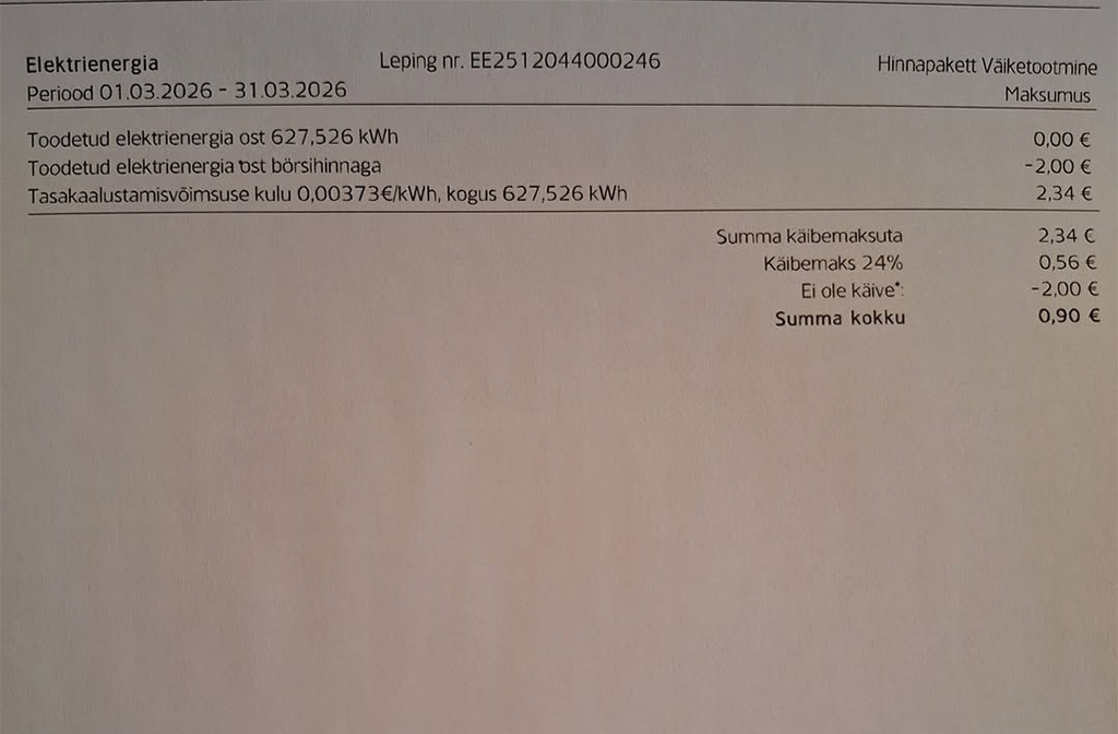 Avaldatud: 9 aprill, 2026Lõuna-Eesti elektrienergia tootja annab teada, et temalt kasseeriti märtsis 627 kWh energia võrku müümise eest 0,9 eurot.