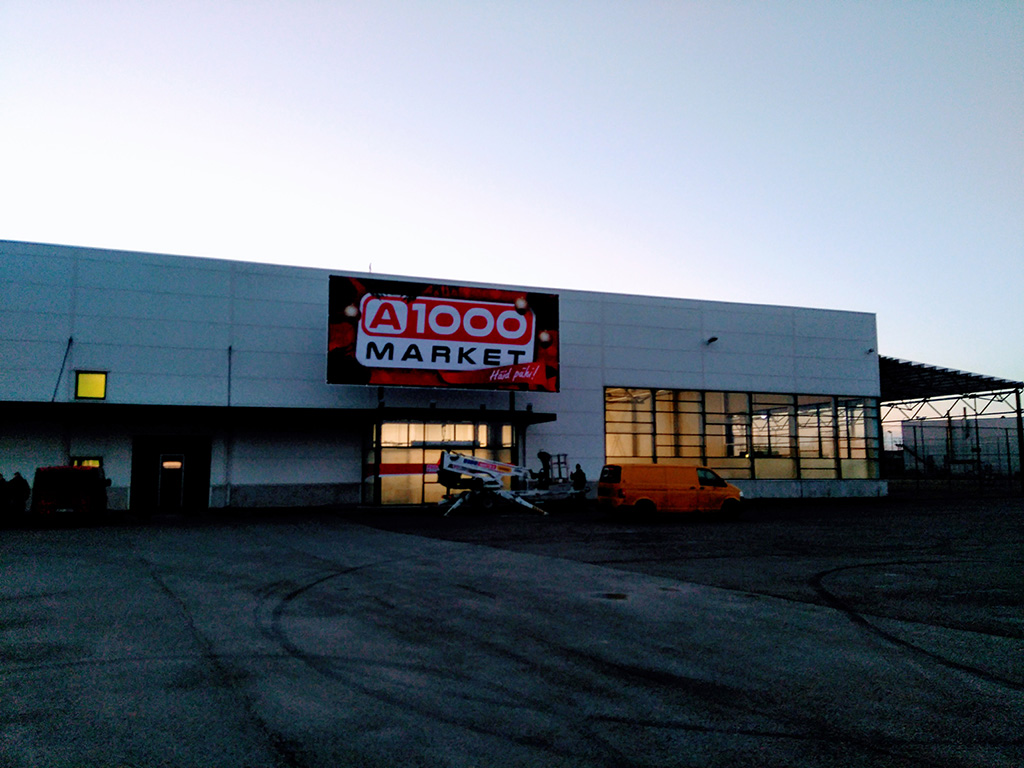 A1000 Marketi avab Lätis alkopoodidega kuulsaks saanud Alko 1000. Ettevõtte juht Einar Visnapuu oli täna kohal ja kinnitas, et pood avatakse järgmisel teisipäeval, 5. detsembril. „Ees on 7 magamata ööd,” ütles Visnapuu ja jälgis kõrvalt, kuidas pandi üles poe silti.