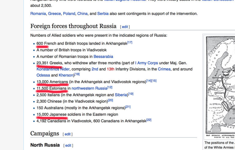 Võrdluseks, ameeriklasi oli punaste vastu väljas 13 000, inglasi ja prantslasi ainult mõnisada, ehk siis laevade meeskonnad, pluss väeosad Arhangelskis. Kõige rohkem oli punaste vastas väljas Musta mere ääres kreeklasi – 23 351, järgnesid jaapanlased 15 000-ga, siis tulid ameeriklased ja siis kohe eestlased. Muljetavaldav, kas pole! Eestlased olid tegijad juba 100 aastat tagasi!