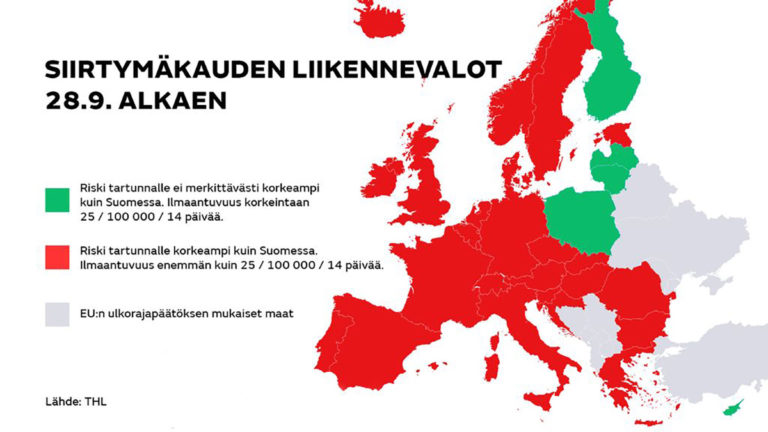 Olemme tänään päivittäneet liikennevalomallin mukaiset kartat ECDC:n 21.9.2020 julkaisemien koronan ilmaantuvuustietojen perusteella. Kartat tulevat voimaan 28.9.