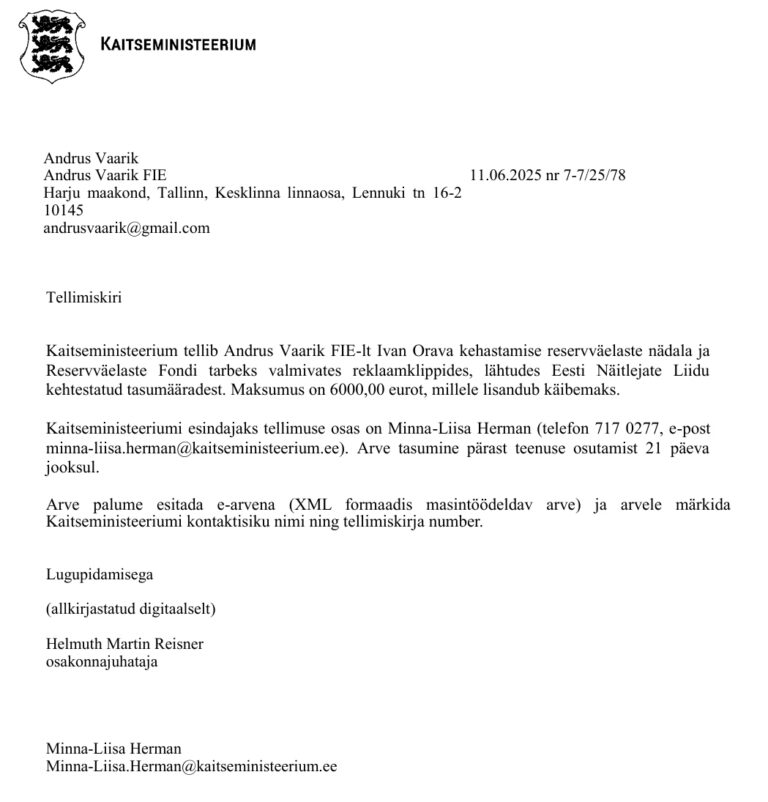 Kaitseministeerium tellib Andrus Vaarik FIE-It Ivan Orava kehastamise reservväelaste nädala ja Reserväelaste Fondi tarbeks valmivates reklaamklippides, lähtudes Eesti Näitlejate Liidu kehtestatud tasumääradest.