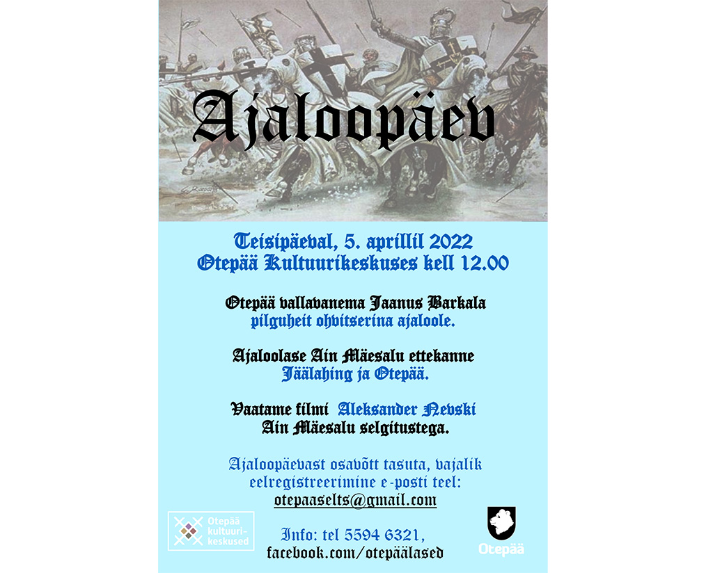 Avaldatud: 29 märts, 2022Nädala pärast 5. aprillil kell 12.00 toimub Otepää kultuurimajas ajaloopäev Jäälahingust.