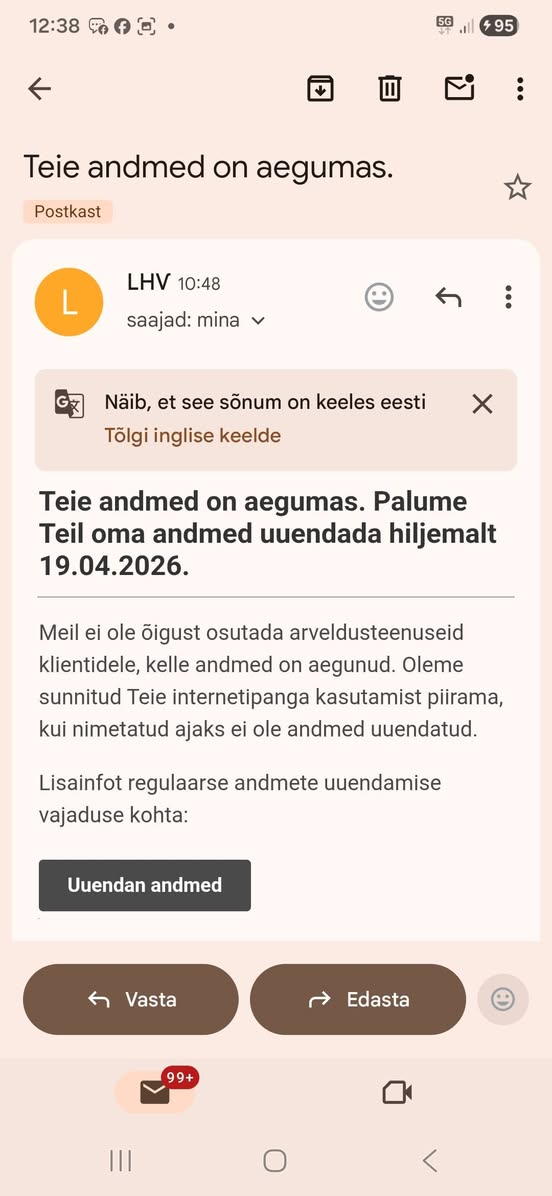 Kui teile tuleb selline kiri meilile, et uuendage LHV andmeid. SIIS SEE ON PETTUS. LHV – EI KÜSI meili teel su andmeid. Panka sisse logides küsib andmeid!!