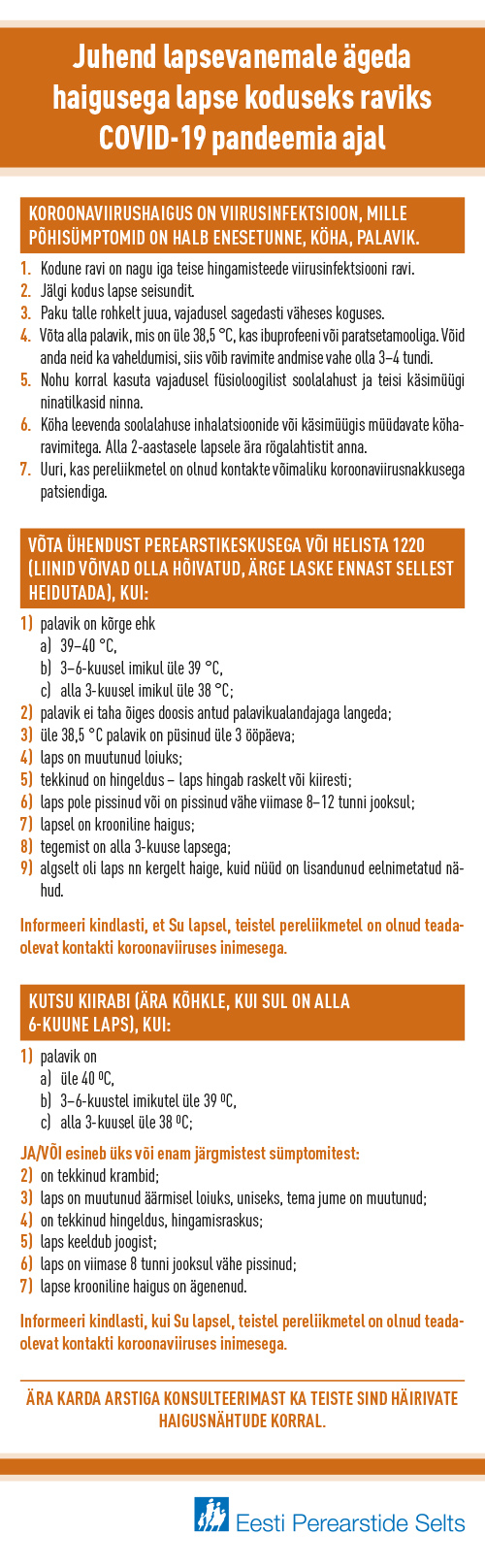 Eesti Perearstide Selts edastas juhendi lapsevanemale ägeda haigusega lapse koduseks raviks COVID-19 pandeemia ajal.