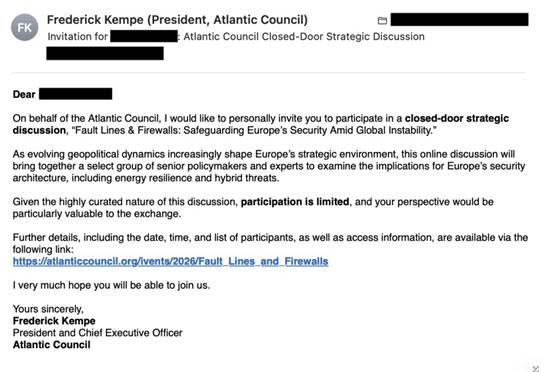 Sel nädalal saatis Riigi infosüsteemi amet (RIA) erinevatesse asutustesse meili, milles hoiatas leviva õngitsuskirja eest. Ka ERR-i jõudnud õngitsuskiri kutsub rahvusvaheliselt tuntud mõttekoja Atlantic Councili juhi Frederick Kempe nime all üles registreerima kinniste uste taga peetavale strateegilisele arutelule.
