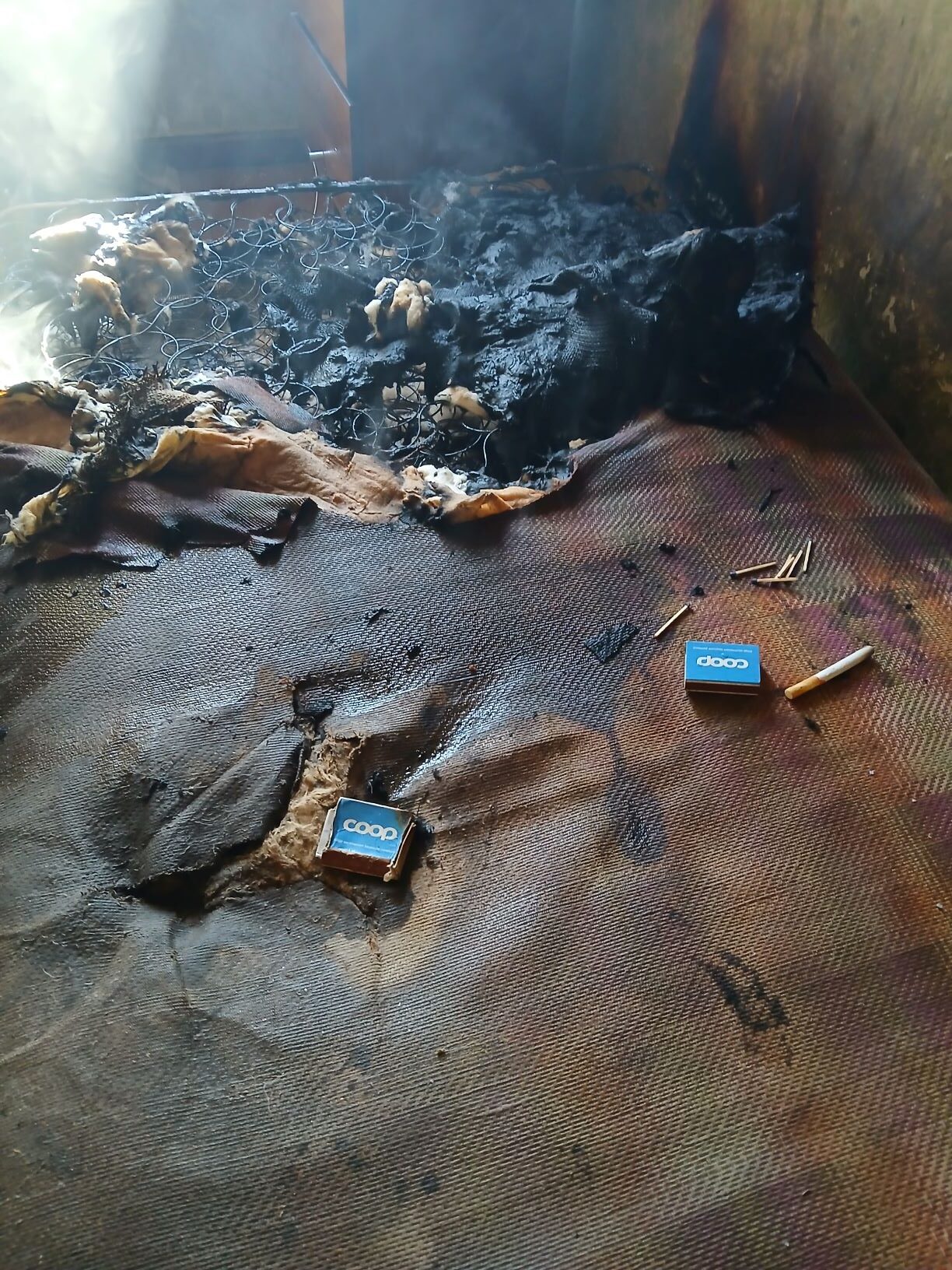 Tulekahju sai alguse hooletust suitsetamisest voodis, hullemast päästis ülemine naaber, kelle korteris hakkas tööle suitsuandur. Korteri ja inimesega tegeleb edasi sotsiaaltöötaja, päästjad teevad kodukülastuse ja paigaldavad suitsuanduri.