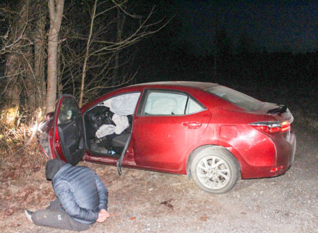 „Politsei asus piirkonnast kahtlusaluseid otsima ning märkas peagi Sürgavere külas Toyotat, mille juht korrakaitsjaid nähes esiti põgeneda püüdis ning siis politseisõidukile külge sõitis. Kokkupõrkest paiskus Toyota vastu puud ning politseinikel õnnestus sõidukijuht kinni pidada. Autos olnud kaks teist meest põgenesid edasi metsa,“ kirjeldas politseijuht.