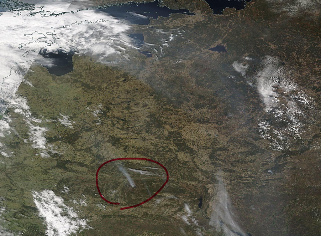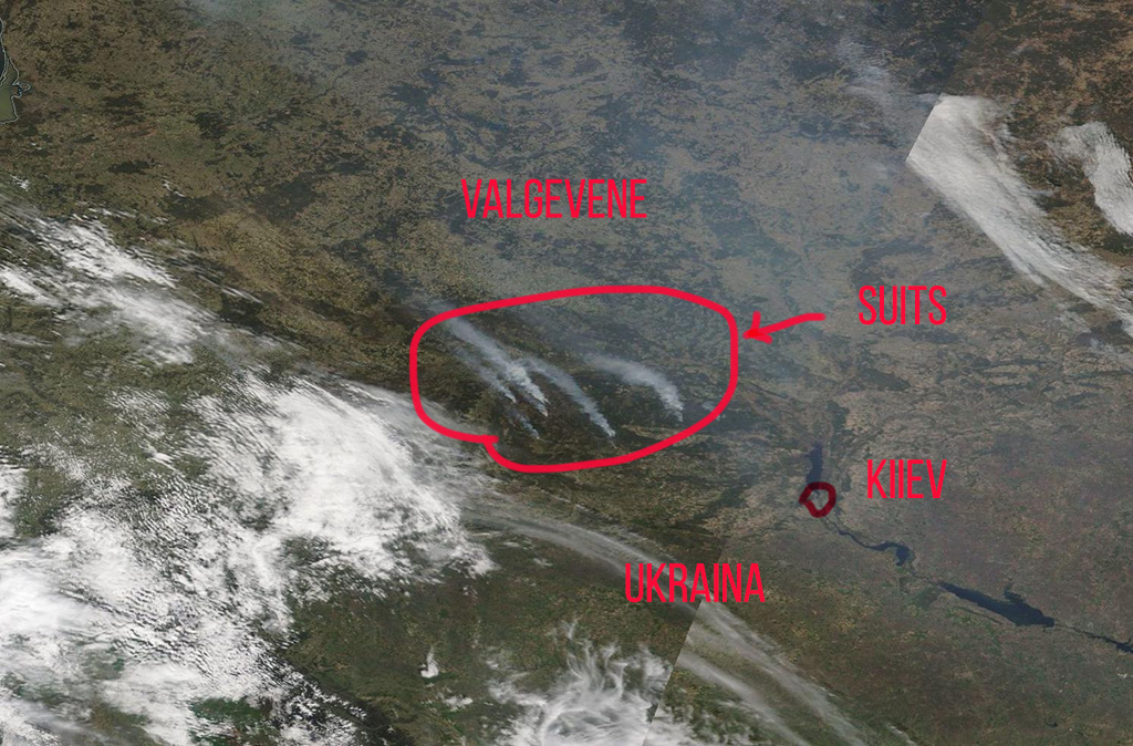 Tulekahju on ka eilselt, 24. aprilli satipildilt näha: see on Kiievist lääne pool, üsna Valgevene piiri ääres. Näha suured suitsujoad.