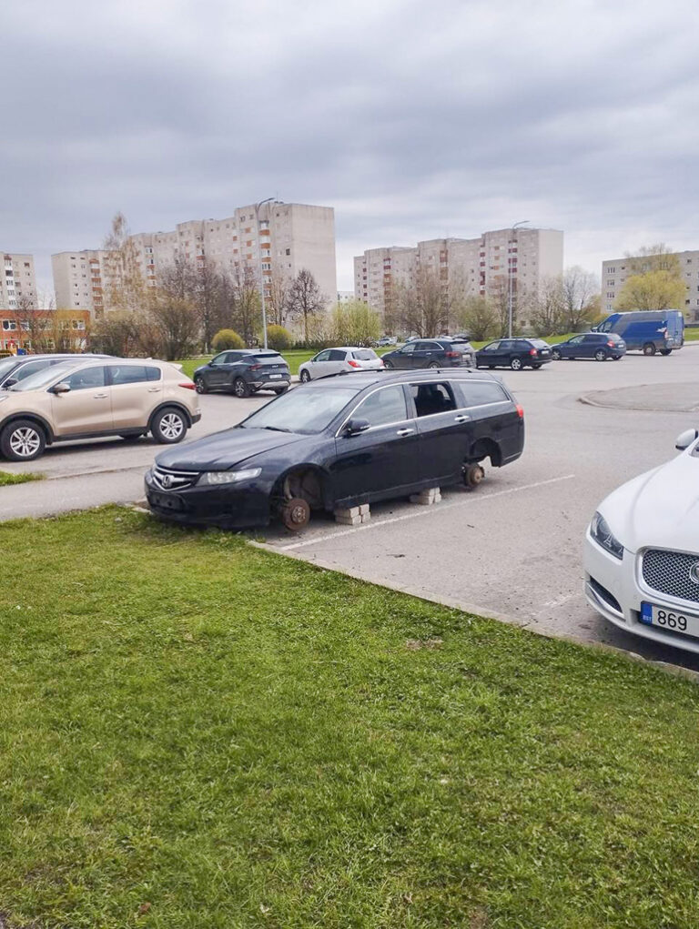 Pildil on näha, kuidas autol on rattad alt võetud ja asendatud kividega. See pilt oli Eestis tavaline 1990ndatel aastatel.