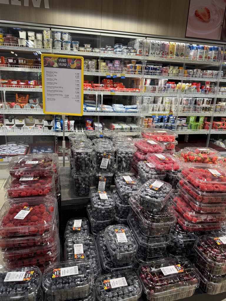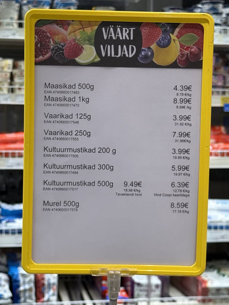 Coopis sees on import maasika hind 8.99 eurot kg. Vaarika kilo on 32 eurot, mustika kilo 12,8 eurot Coopi kaardiga. Mureli kilo on 17 eurot.