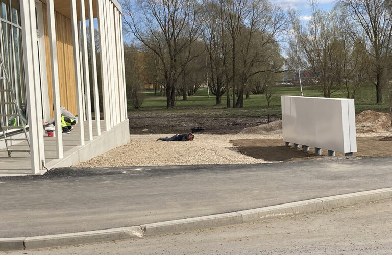 Pildil on näha meest tervisekeskuse maja ees päiksepaistel pikutamas. Kõrval veel ehituskopad töötasid ja käisid viimased viimistlustööd.