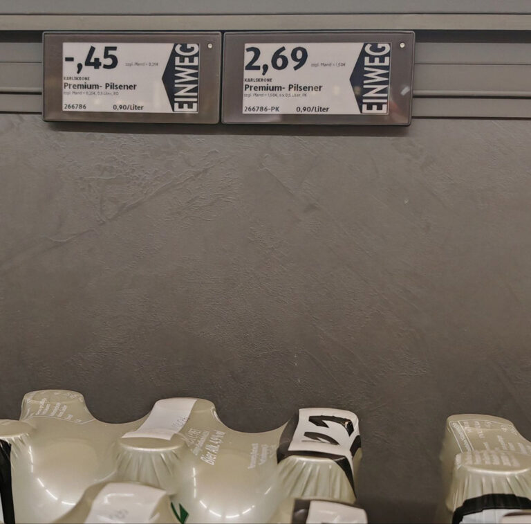 Lõunaeestlase lugeja saatis pildi õlle hinnast Saksamaal Aldi ja Lidli poodides. 0,5 liitrit maksab 45 senti, 6-pakk 2,69 eurot.