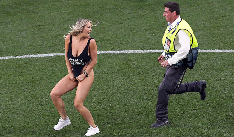 Avaldatud: 1 juuni, 2019Napis ujumistrikoos vene modell tormas täna Madriidis meistrite liiga finaalmatši ajal väljakule. Tegemist oli Tottenhami-Liverpooli matši esimese poolajaga.