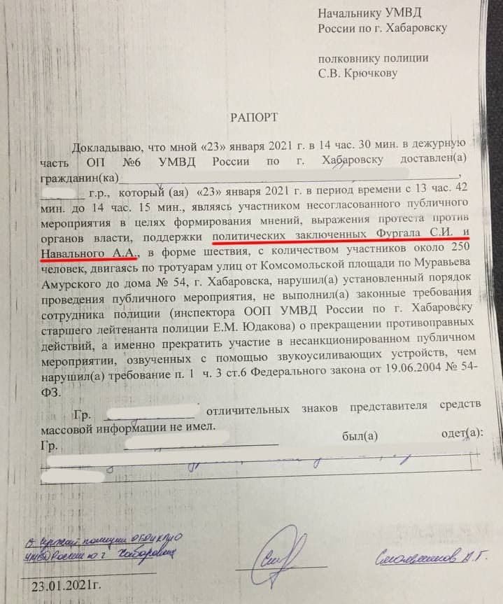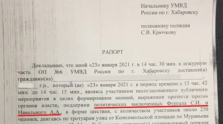 Politseijaoskonna töötaja kirjutas aruandes kohalikule politseijuhile, et vahistamise põhjus oli „poliitvangide Furgali ja Navalnõi toetamine”.