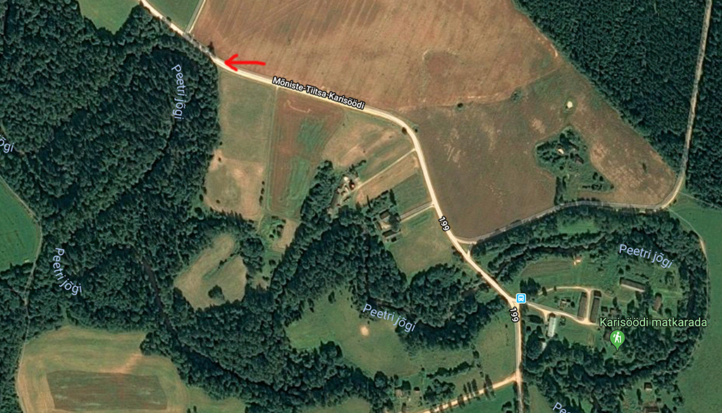 Autoõnnetuse asukoht kaardil Karisöödi külas. Noolega tähistatud asukoht ja auto liikumissuund. Suuremalt vaatamiseks kliki pildil. Kaart: Google Maps