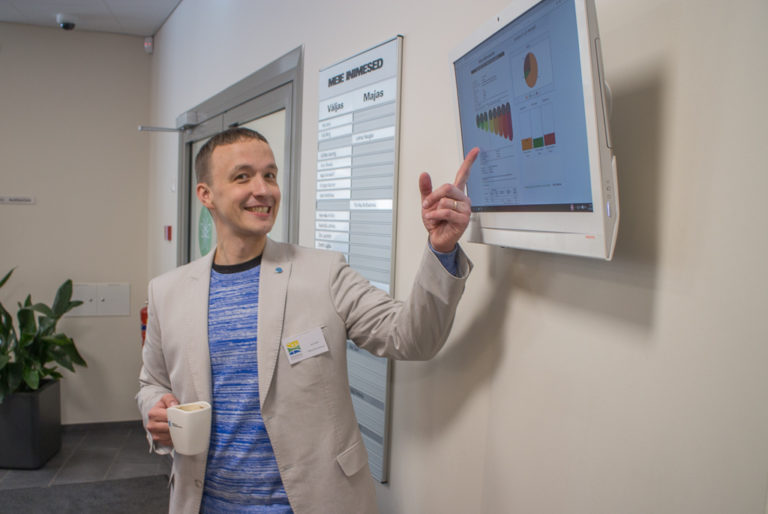 Pildil näitab Põlva Gümnaasiumi direktor Alo Savi koolimaja välisukse kõrval asuvat monitori, kus on näha reaalajas kogu hoone energiatarbimine.