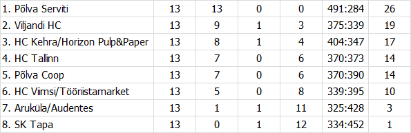 Eesti käsipalli meistriliiga tabeliseis on järgmine (suuremalt vaatamiseks kliki pildil):