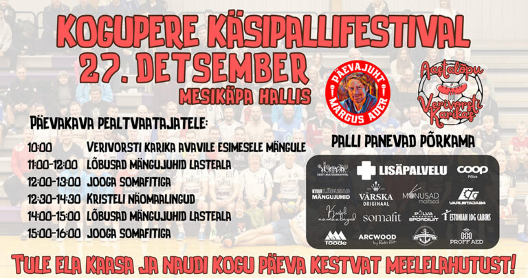 Avaldatud: 22 detsember, 202527. detsembril toimub Põlvas Mesikäpa hallis pühadehõnguline käsipalliturniir Verivorsti Karikas 2025, mis toob platsile nii praegused kui endised käsipallurid.