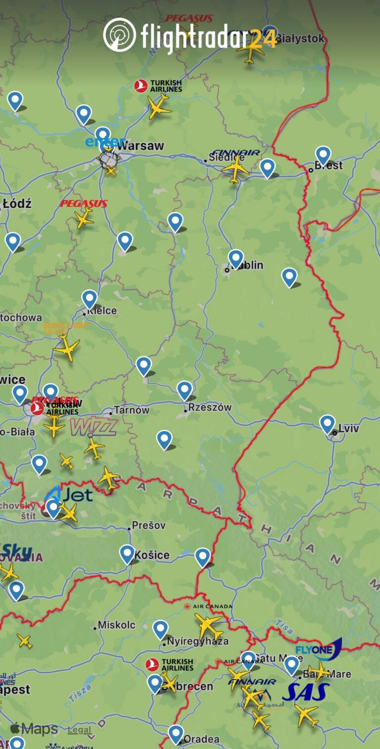 Flightradari andmetel avaldasid Ida-Poolas asuvad Rzeszówi ja Lublini lennujaamad ametlikke lennundusteateid (NOTAM), milles öeldi, et õhuruumi sulgemise põhjuseks on sõjaline tegevus.