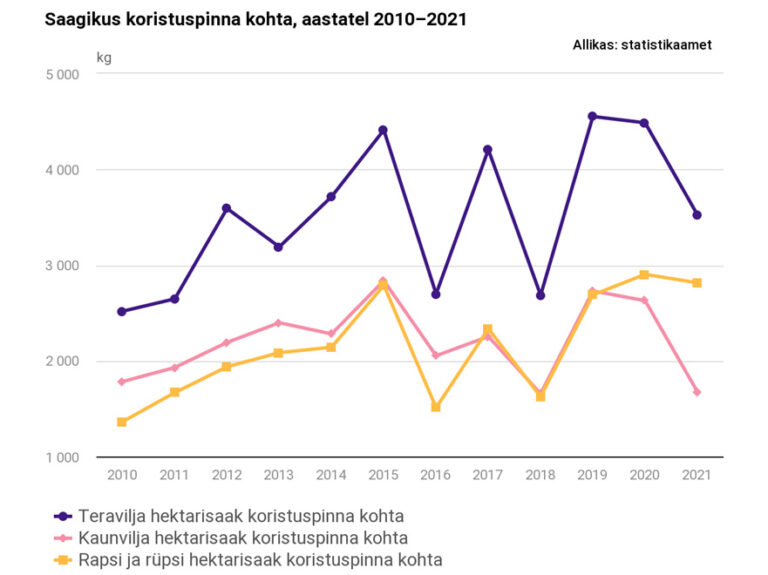 Koristatud pindadelt saadi hektari kohta keskmiselt 3600 kilogrammi (kg) teravilja. Taliteravilja keskmiseks saagikuseks kujunes 4500 ja suviviljal 2600 kg hektarilt, mis on vastavalt 15 protsenti ja 30 protsenti vähem kui eelmisel aastal.