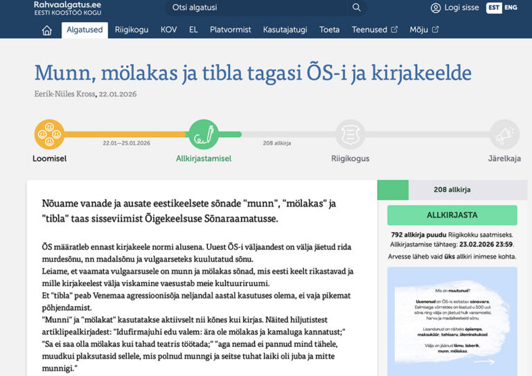 Avaldatud: 26 jaanuar, 2026Rahvaalgatuses nõutakse vanade ja ausate eestikeelsete sõnade „munn”, „mölakas” ja „tibla” taas sisseviimist Õigekeelsuse Sõnaraamatusse.