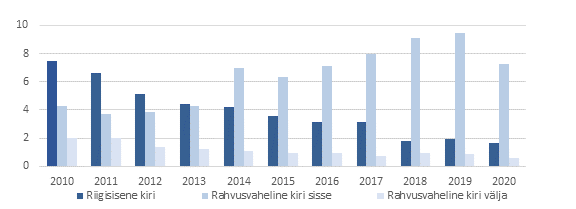 Universaalse postiteenusena edastatud kirjade arv aastatel 2010–2020 (miljonites tükkides)